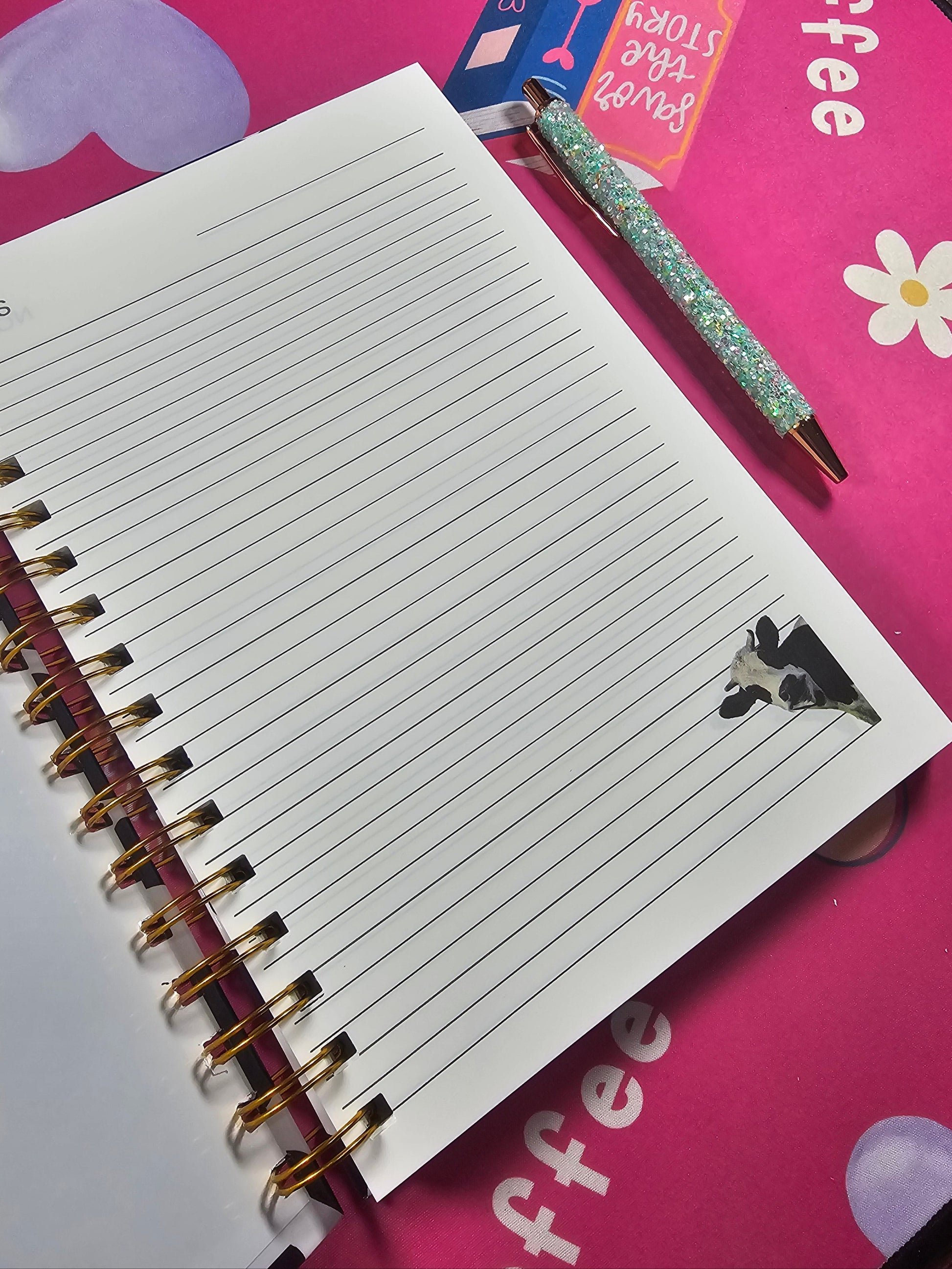 Comes with a pen and of course, some too cute surprise cow stickers!