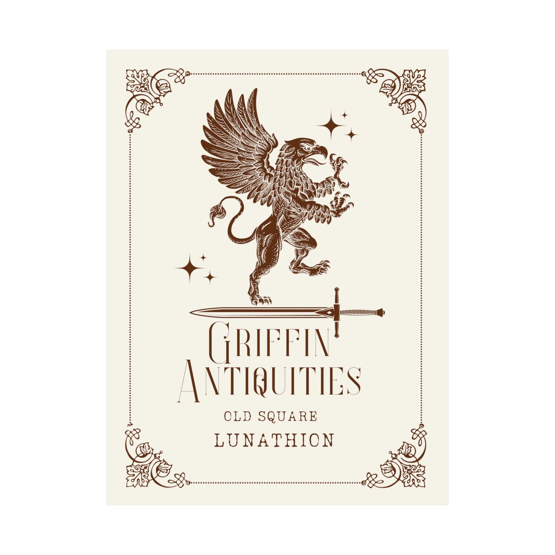 Step into Old Square and bring a piece of Lunathion’s history into your space with this Griffin Antiquities matte poster. Featuring the iconic griffin crest and sword design, this piece is the perfect blend of fantasy lore and vintage style, ideal for fans of Crescent City or anyone with a love for mystical, bookish aesthetics.